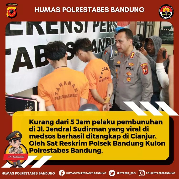 “Kurang dari lima jam, pelaku ditangkap oleh jajaran Polsek Bandung Kulon Polrestabes Bandung” kata Kapolrestabes Bandung Kombes Aswin Sipayung. S. I. K. M. H didampingi Kapolsek Bandung Kulon Kompol Asep Nandang di Mapolrestabes Bandung.