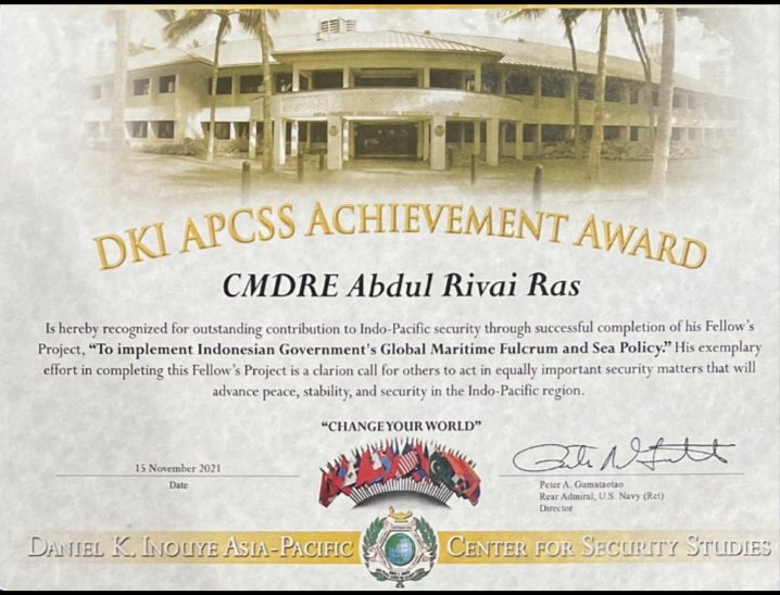 JAKARTA | Daniel K. Inouye Asia-Pacific Center for Security Studies (APCSS) memberikan Achievement Award kepada Laksma TNI Dr. Abdul Rivai Ras, Staf Khusus Panglima TNI yang akrab disapa Bro Rivai.