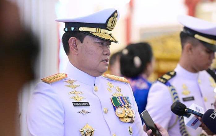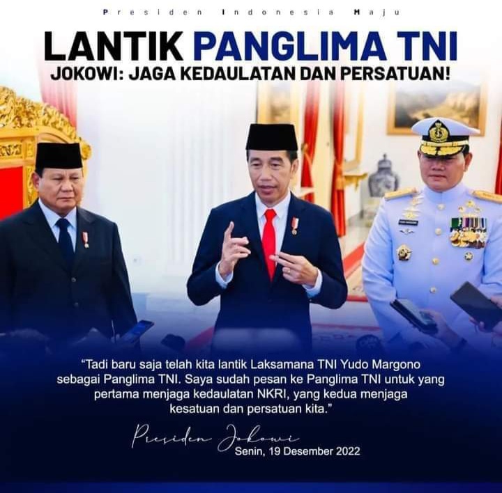 “Tadi baru saja telah kita lantik Laksamana TNI Yudo Margono, di samping saya, sebagai Panglima TNI, dan saya sudah pesan ke Panglima TNI untuk yang pertama menjaga kedaulatan NKRI, yang kedua menjaga kesatuan dan persatuan kita,” ujar Presiden dalam keterangannya kepada awak media usai pelantikan.