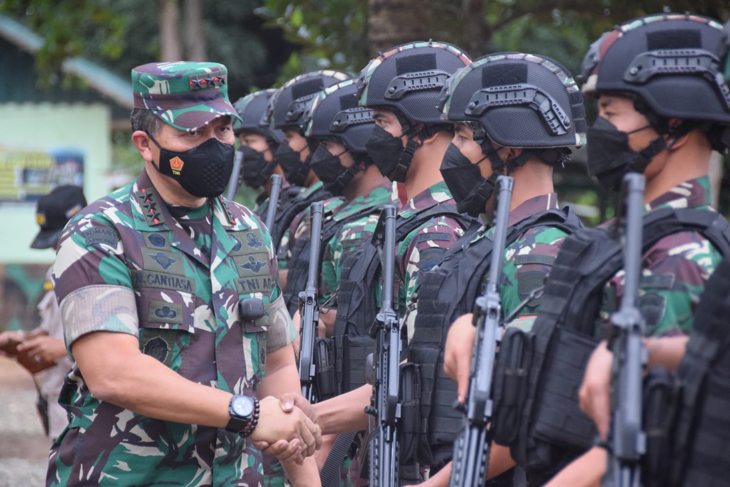 Kedatangan Pangkogabwilhan III Letjen TNI I Nyoman Cantiasa, S.E., M. Tr (Han) beserta rombongan ke Pos Kout Satgas Yonif 123/RW disambut Dansatgas dan Hormat jajar oleh prajurit Satgas Yonif 123/Rajawali beserta para Perwira Satgas.
