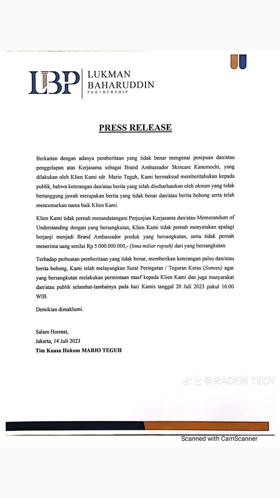 “Pemberitaan yang tidak benar mengenai penipuan dan/atau penggelapan atas Kerjasama sebagai Brand Ambassador Skincare Kanemochi, yang dilakukan oleh Klien Kami Sdr. Mario Teguh, Kami bermaksud memberitahukan kepada publik, bahwa keterangan dan/atau berita yang telah disebarluaskan oleh oknum yang tidak bertanggung jawab merupakan berita yang tidak benar dan/atau berita bohong serta telah mencemarkan nama baik Klien Kami,” demikian bunyi keterangan yang disampaikan kuasa hukum Mario Teguh, Jumat (14/7).