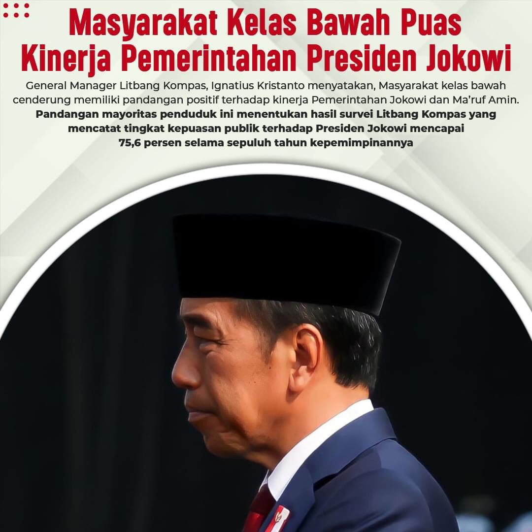 General Manager Litbang Kompas, Ignatius Kristanto menyatakan, pandangan mayoritas penduduk ini menentukan hasil survei Litbang Kompang yang mencatat tingkat kepuasan publik terhadap Presiden Jokowi mencapai 75,6 persen selama sepuluh tahun kepemimpinannya.