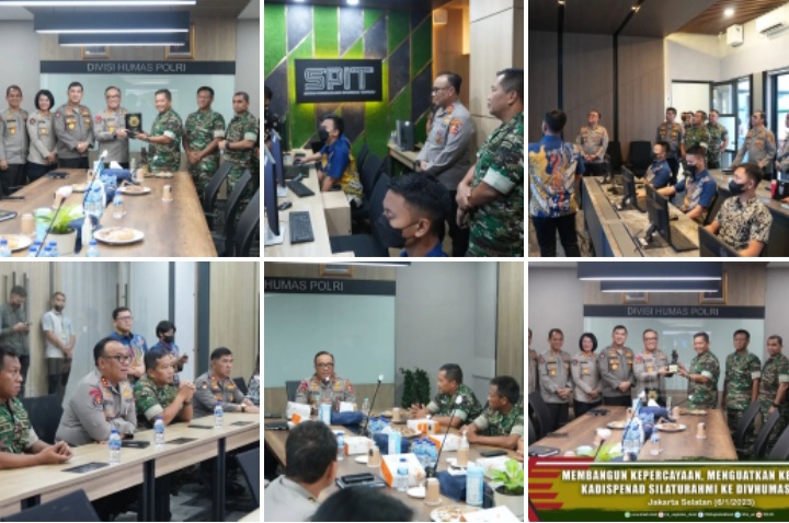 JAKARTA | Kepala Dinas Penerangan TNI Angkatan Darat (Kadispenad), Brigjen TNI Hamim Tohari didampingi pejabat Dispenad mengunjungi kantor Divisi Humas (Divhumas) Polri, di Mabes Polri, Jl. Trunojoyo, Jakarta Selatan, Jumat (6/1/2023).