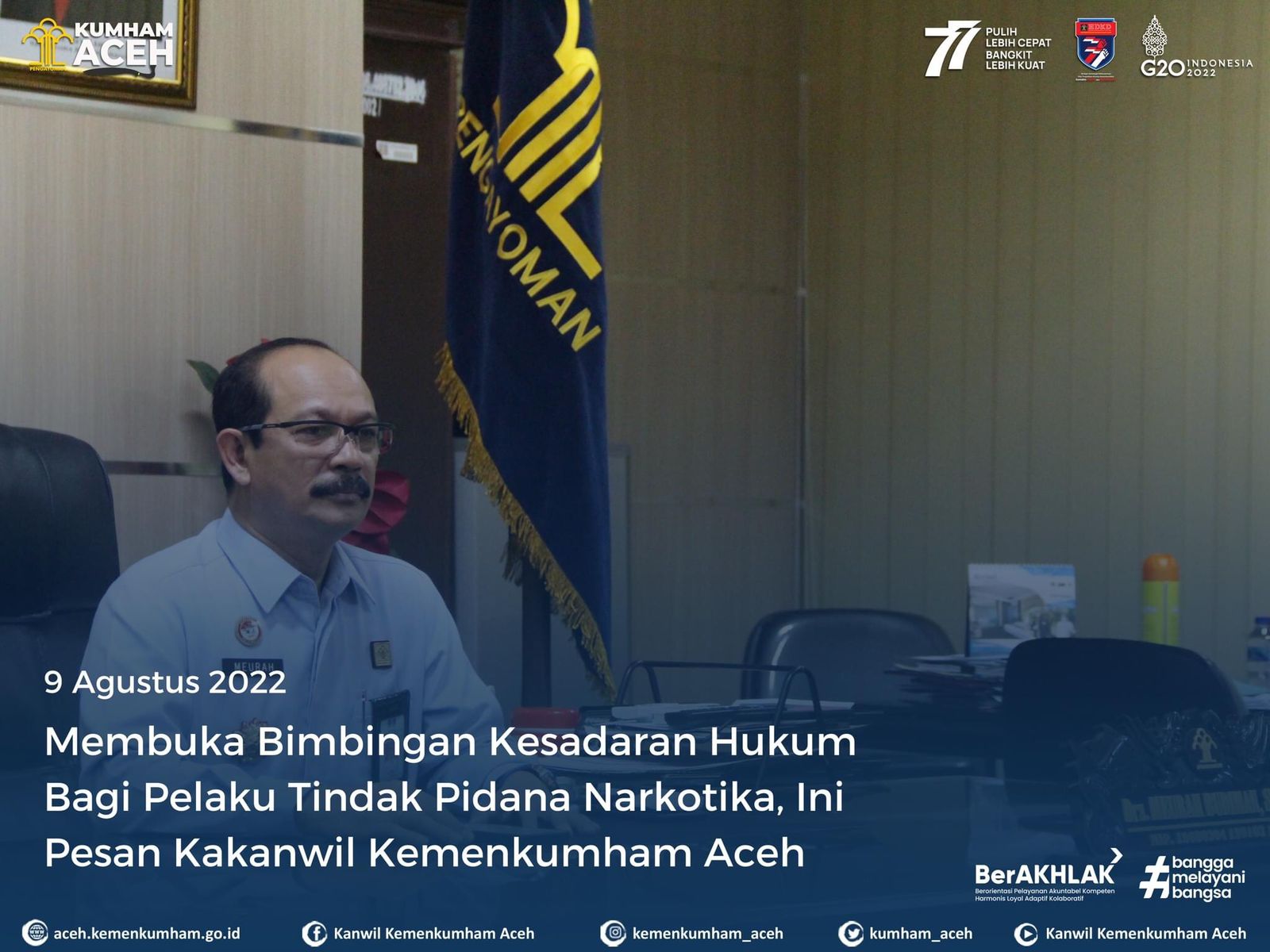 Meurah Budiman menjelaskan hal tersebut saat membuka kegiatan Bimbingan Kesadaran Hukum Bagi Pelaku Tindak Pidana Narkotika Klien Pemasyarakatan Bapas Kelas II Kutacane secara virtual melalui media zoom meeting.