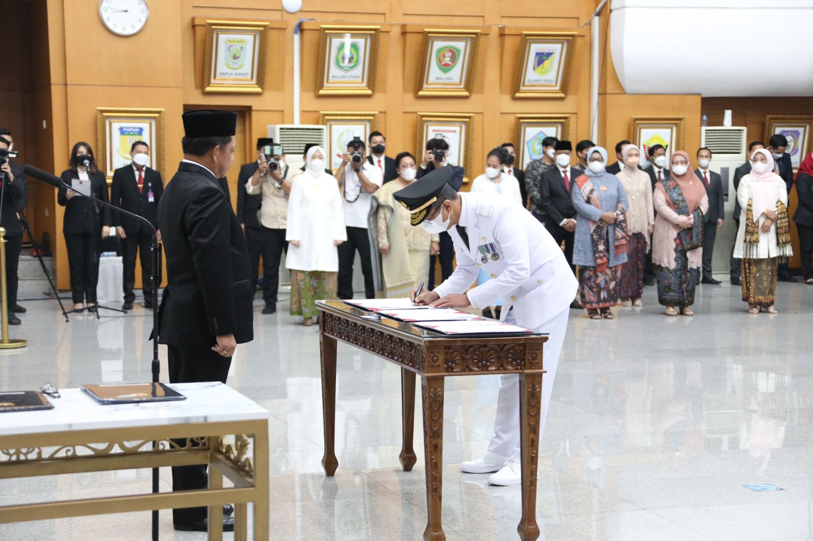 JAKARTA | Menteri Dalam Negeri (Mendagri) Muhammad Tito Karnavian resmi melantik Kepala Sekretariat Presiden Heru Budi Hartono sebagai Penjabat Gubernur DKI Jakarta menggantikan Anies Baswedan. Pelantikan berlangsung di Gedung Sasana Bhakti Praja Kantor Pusat Kemendagri, Senin (17/10/2022).