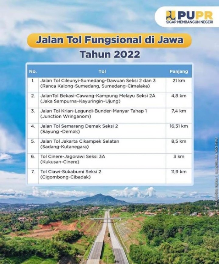 JAKARTA | Untuk mendukung kesiapan lalu lintas pada Nataru tahun 2022/2023, Kementerian PUPR akan mengoperasional secara fungsional 7 ruas tol di Jawa dan 2 ruas tol di Sumatra.