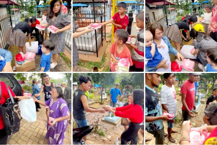 Mereka menaburkan bunga, berdoa bersama, hingga membagikan tali kasih berupa kue kotak dan minuman kepada para petugas kuburan dan warga setempat lainnya.