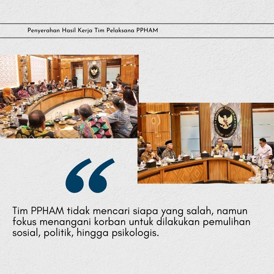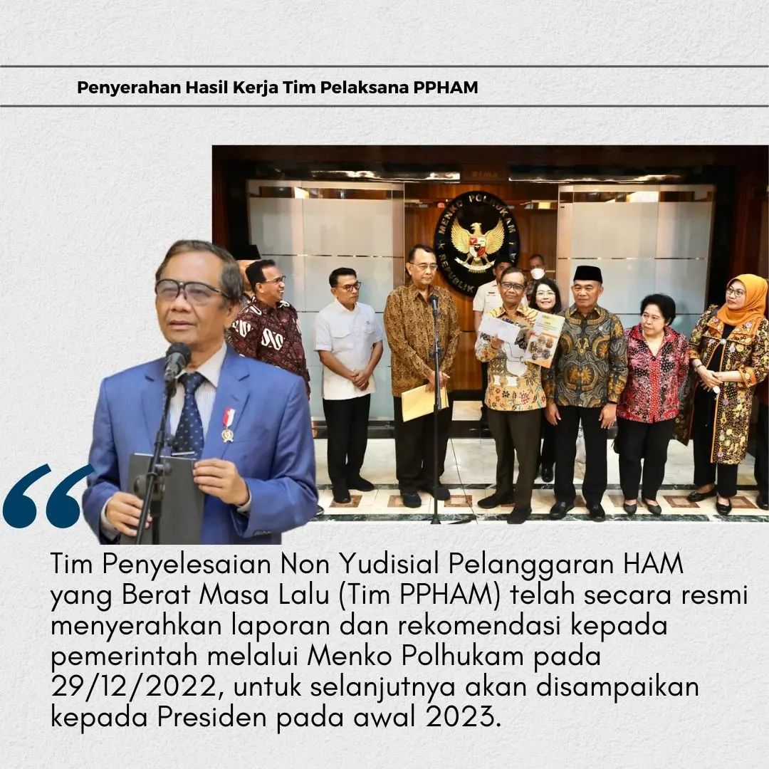 JAKARTA | Tim Penyelesaian Non Yudisial Pelanggaran HAM yang Berat Masa Lalu (Tim PPHAM) telah secara resmi menyerahkan laporan dan rekomendasi kepada pemerintah melalui Menko Polhukam pada 29/12/2022.