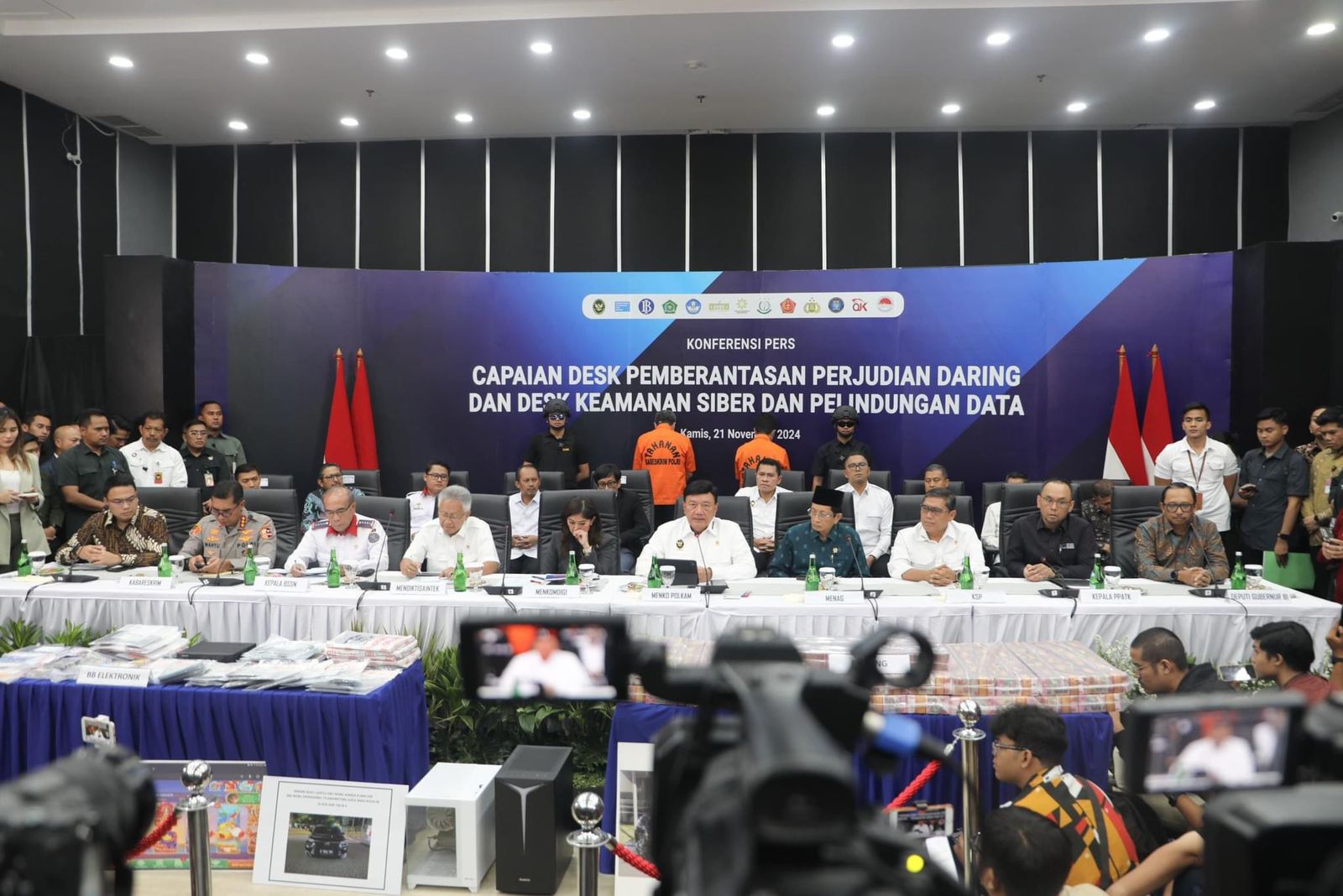 “Judi online kondisinya saat ini sudah sangat meresahkan, mengkhawatirkan, dan darurat. Bapak Presiden pada beberapa kesempatan telah menyampaikan, judi online yang ada di Indonesia telah mencapai kurang lebih Rp 900 triliun di tahun 2024. Pemainnya kurang lebih 88 juta yang mayoritas para pemainnya adlah kelas menengah ke bawah, 97 ribu anggota TNI dan Polri dan 1,9 juta pegawai swasta yang bermain judi online,” ujar Menko Polkam Budi Gunawan kepada media usai memimpin Rapat Koordinasi Tingkat Menteri membahas Pencapaian Kinerja Desk Perjudian Daring dan Desk Keamanan Siber dan Perlindungan Data di kantor Kementerian Komunikasi dan Digital, Jakarta, Jum’at (22/11/2024).