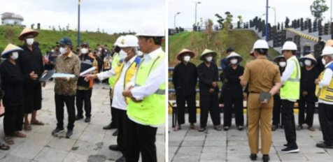 Turut mendampingi Presiden saat berdialog dengan para petani yaitu Menteri Pekerjaan Umum dan Perumahan Rakyat (PUPR) Basuki Hadimuljono dan Menteri Agraria dan Tata Ruang/Badan Pertanahan Nasional (ATR/BPN) Hadi Tjahjanto.