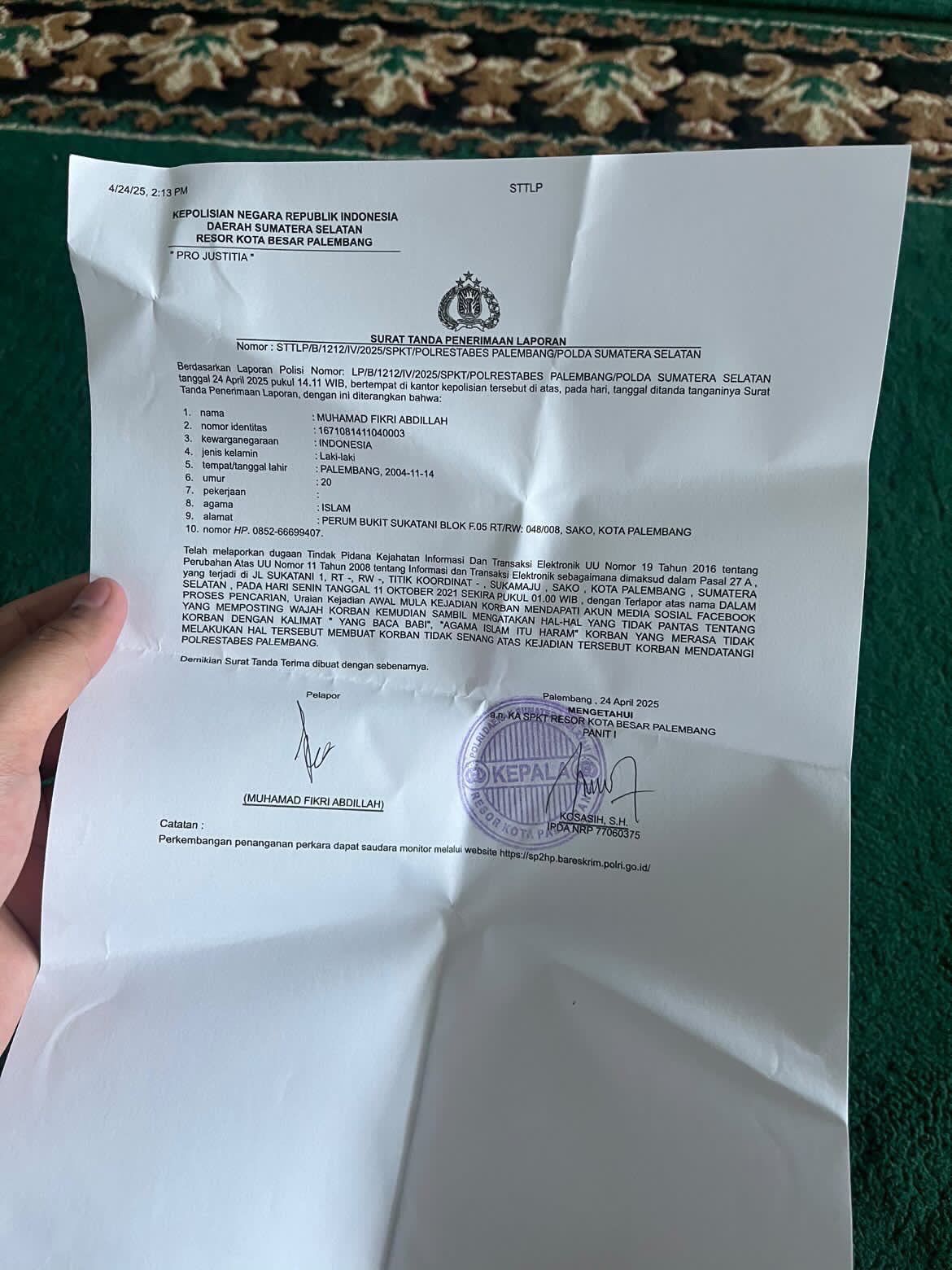 PALEMBANG – Muhammad Fikri Abdillah resmi melaporkan dugaan kasus pencemaran nama baik yang dialaminya ke Polrestabes Palembang, pada Senin (16/06).