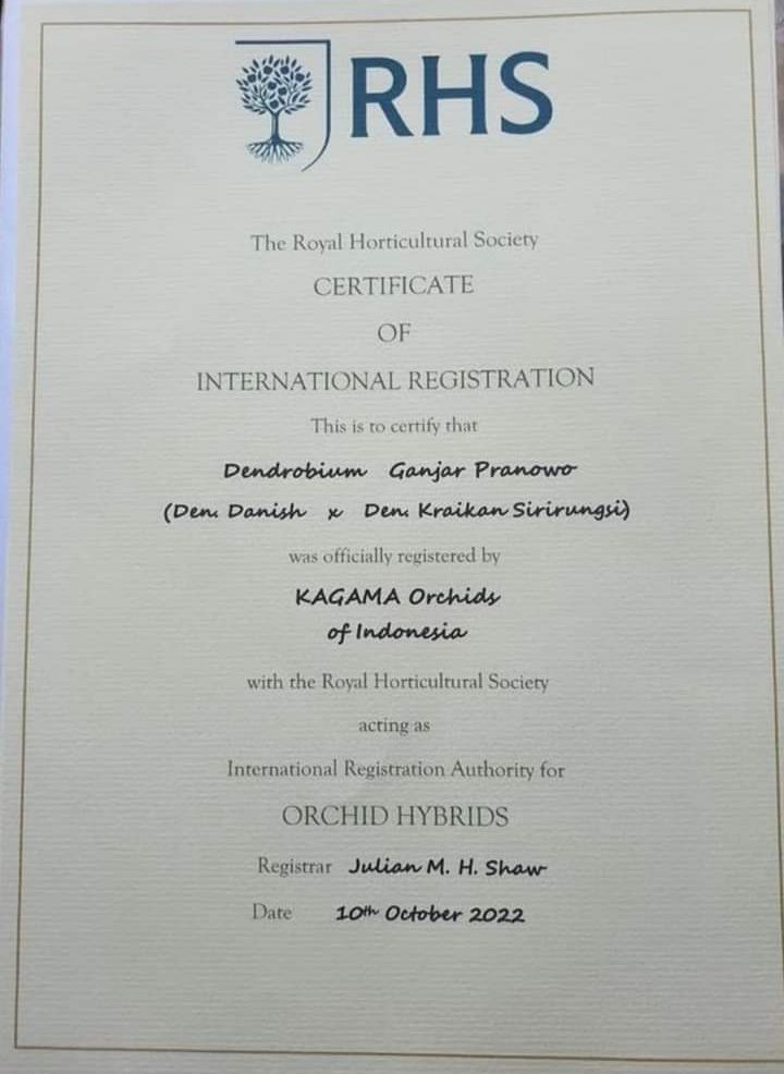 JAKARTA | Nama Gubernur Jawa Tengah (Jateng) diabadikan menjadi nama jenis bunga anggrek, yakni Dendrobium Ganjar Pranowo. Bunga anggrek merah itu bersertifikat resmi dari The Royal Horticultural Society Inggris.