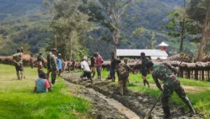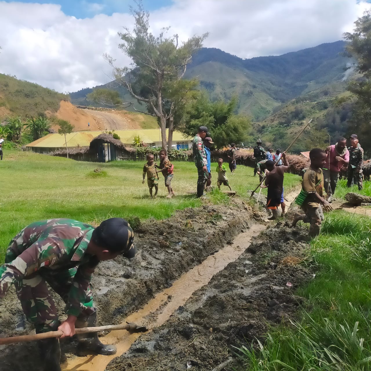Lanny Jaya, Papua | Lagi, Prajurit Satgas Yonif MR 412 Kostrad hadir ditengah- tengah masyarakat pedalaman Papua untuk bergotong royong kerja bakti bersama masyarakat Desa Balingga membantu memperlebar dan membersihkan saluran air sepanjang kurang lebih 300 meter yang berada di depan Puskesmas Desa Balingga Distrik Balingga Kabupaten Lanny Jaya Papua
