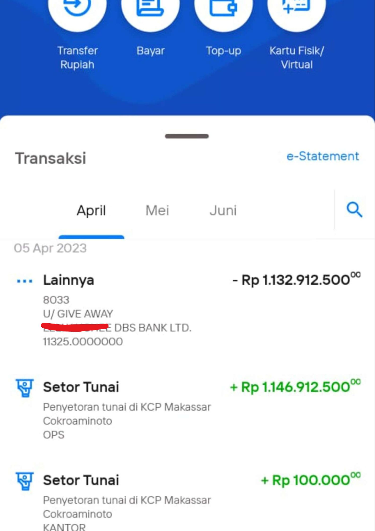 Dalam kartu tersebut tertulis keterangan pembukaan Rekening Tanggal 05 April 2023 setor tunai sebesar Rp1.00.000 (Satu Juta Rupiah). Kemudian setor tunai sebesar Rp1.146.912.500 (Satu Miliar sekian). Tak lama kemudian dari saldo tersebut tiba – tiba muncul tarik tunai sebesar Rp1.132.912.500 atas nama inisial LU (LU adalah istri Owner Perusahaan Tambang di Desa Torobulu), DBS LTD.11325.0000000, U/Give Away.