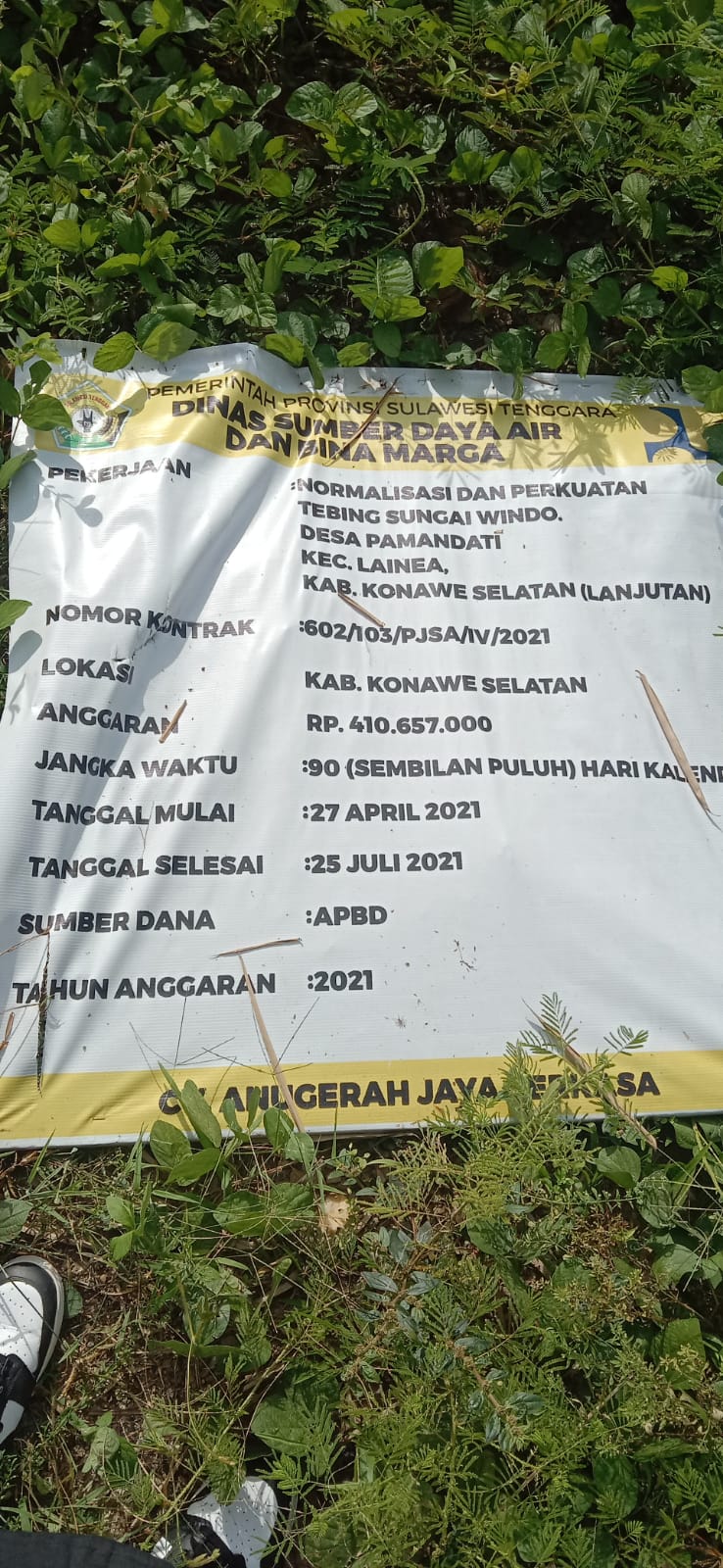 Pantauan media ini, Proyek Pembangunan Bronjong dengan anggaran sebesar Rp. 410.657.000 yang bersumber dari Dinas Sumber Daya Air dan Bina Marga Provinsi Sulawesi Tenggara, Tahun 2021 yang terletak di Desa Pamandati Kecamatan Lainea Kabupaten Konawe Selatan (Kab. Konsel) diduga tidak sesuai dengan perencanaan sebelumnya.
