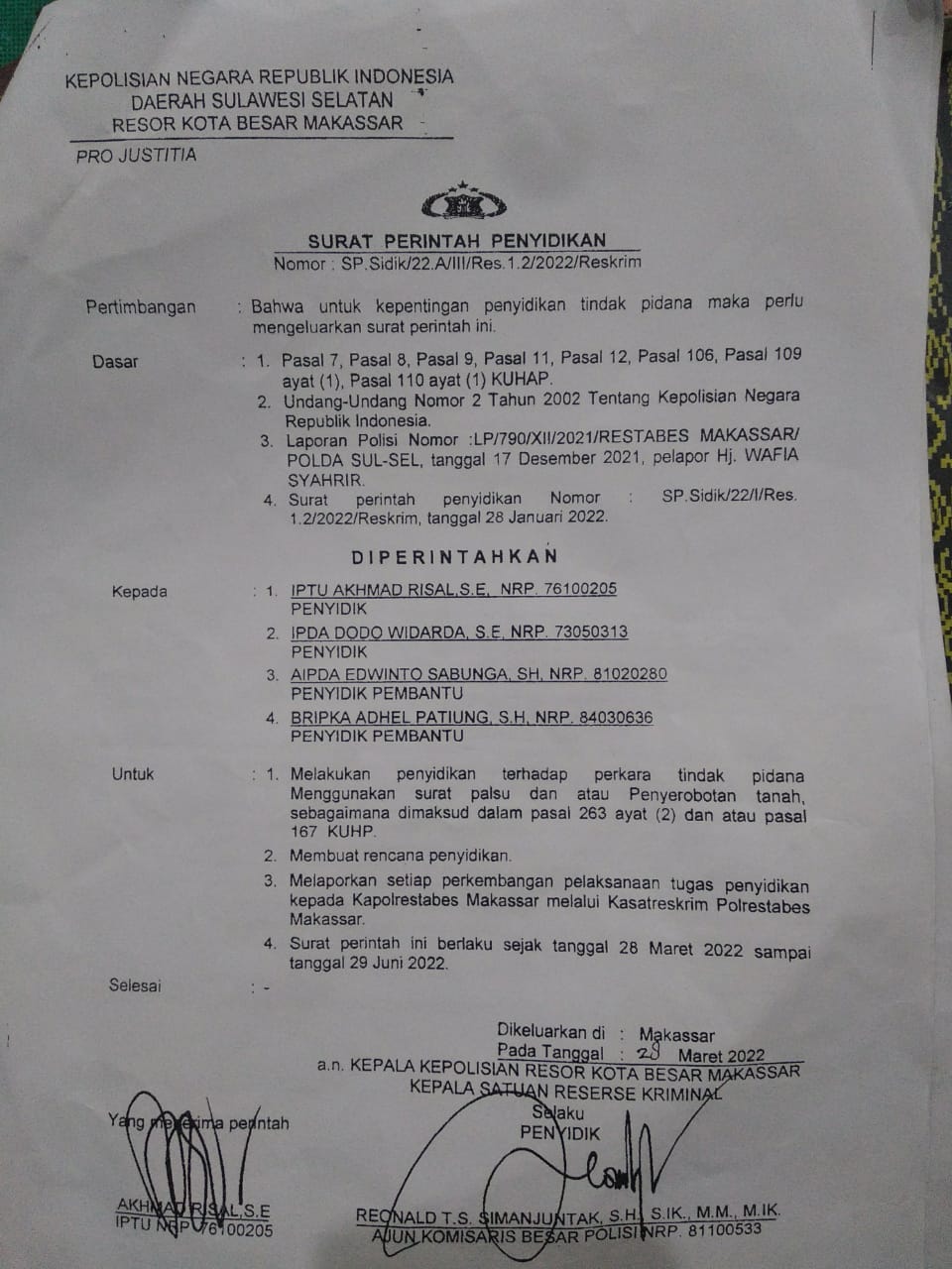Jelas ditemukannya indikasi penyalah gunaan jabatan dan wewenang terkait pembuatan penyelidikan pasal 176 dan munculnya pasal siluman 263 ayat 2 oknum Panit bersama penyidik tahbang Polrestabes Makassar,