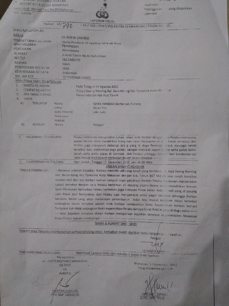 Lanjutnya, “Pada saat kami melihat surat surat kepelikan si perempuan Hj. Wafiah Syahril ini selanjutnya kami melakukan penelusuran ke kantor BPN kota Makassar, tapi sampai sekarang belum ada info resmi dari BPN kota Makassar yang kami dapat.”