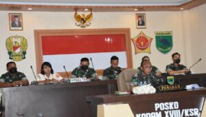 MANOKWARI |Pangdam XVIII/Kasuari, Mayjen TNI Gabriel Lema, S.Sos., didampingi para pejabat Kodam ikuti Vicon yang dipimpin langsung oleh Panglima TNI Jenderal TNI Andika Perkasa, dari ruang Posko Kodam, Trikora, Arfai 1, Manokwari, Papua Barat, Sabtu (16/4/2022).