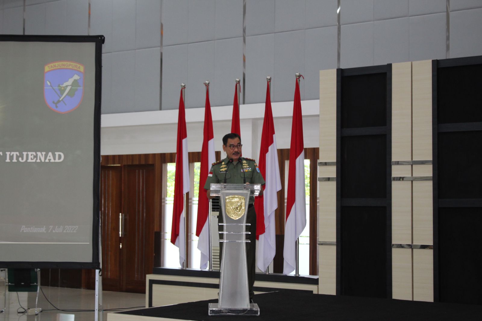 KUBU RAYA,KALBAR | Panglima Kodam XII/Tanjungpura Mayjen TNI Sulaiman Agusto, S.I.P., M.M., menerima taklimat akhir kegiatan pengawasan dan pemeriksaan Tim Post Audit Itjenad Tahun Anggaran 2022. Kegiatan berlangsung di Aula Sudirman, Makodam XII/Tpr, Jalan Arteri Alianyang, Sungai Raya, Kubu Raya,(7/7/22).