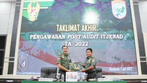 Pada kesempatan ini, Pangdam XII/Tpr menerima laporan hasil pengawasan dan pemeriksaan dari Wairjenad, Mayjen TNI Hassanudin, S.I.P., M.M. Untuk diketahui, kegiatan tersebut telah dilaksanakan oleh Tim Audit Itjenad mulai dari tanggal 27 Juni sampai dengan 7 Juli 2022 di satuan jajaran Kodam XII/Tpr.