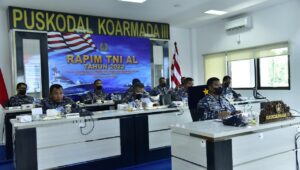 Sementaran itu secara virtual, Kepala Staf Koarmada III Laksamana Pertama TNI Yeheskiel Katiandagho S.E., M.M., M.H, Inspektur Koarmada III Laksamana Pertama TNI DR. Toto Dwijaya Saputra S.T., M.SI(Han)., M.TR.Opsla. dan Pejabat Utama Koarmada III lainnya, serta Para Komandan Satuan Koarmada III mengikuti Rapim TNI Angkatan Laut Tahun 2022 di Puskodal dan Ruang Rapat Mako Koarmada III Katapop Kabupaten Sorong Papua Barat.