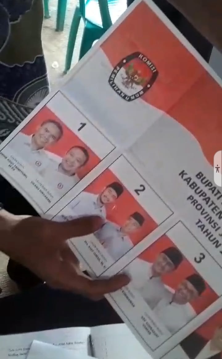 INFOINDONESIAINEWS.COM | BANDUNG BARAT, JABAR – Salah satu surat suara untuk pemilihan Bupati dan Wakil Bupati KBB, sudah ada yang nyoblos di TPS 12 Desa Citapen Kecamatan Cihampelas, Rabu (27/11).