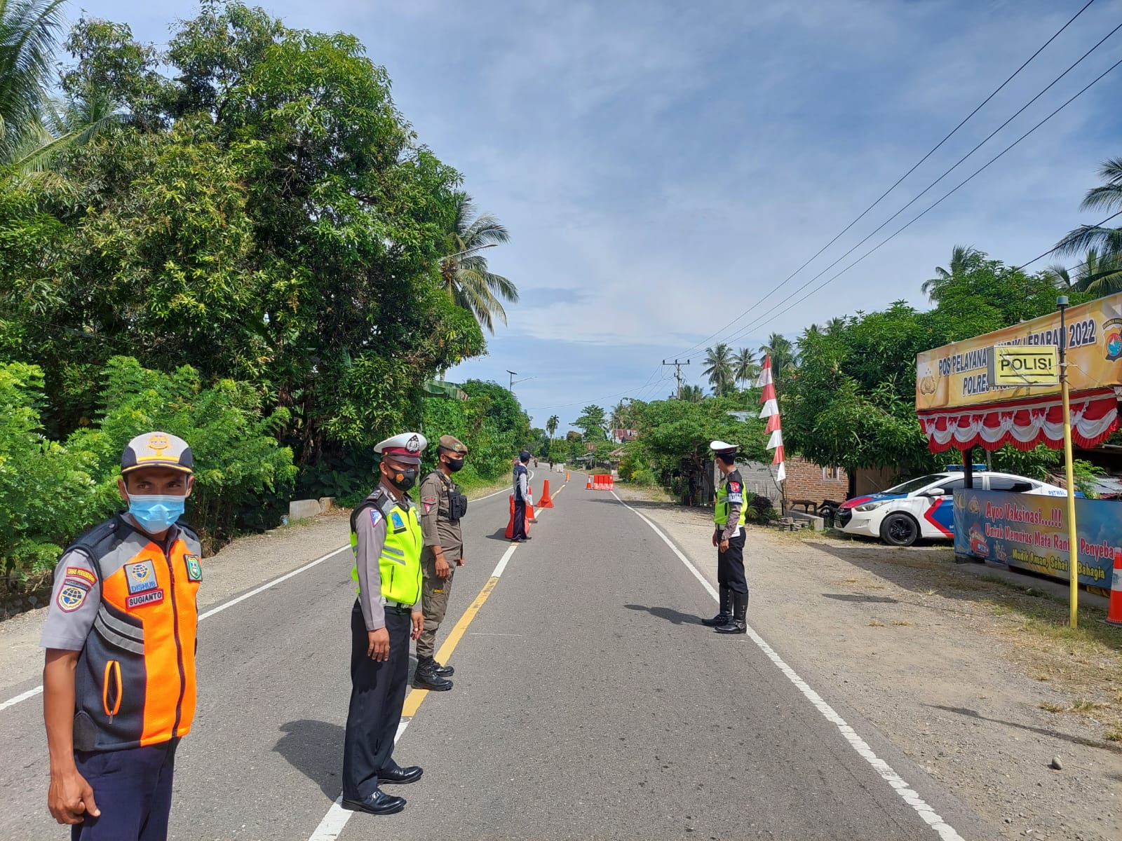 POLRES PASANG KAYU | Sejumlah anggota kepolisian melakukan pengaturan arus mudik lebaran. Terpantau anggota Polres Pasangkayu bersama Instansi terkait berjaga di Pos Pelayanan Sarjo Kecamatan sarjo Kabupaten Pasangkayu Rabu (04/05/2022)