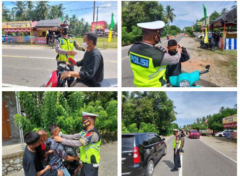 ” Personil juga memberikan masker kepada Pengendara yang melintas bagi yang tidak menggunakan masker dan tetap mengingatkan agar tetap berhati-hati dan menjaga keselamatan saat di perjalanan” Ucap Kapos Pam