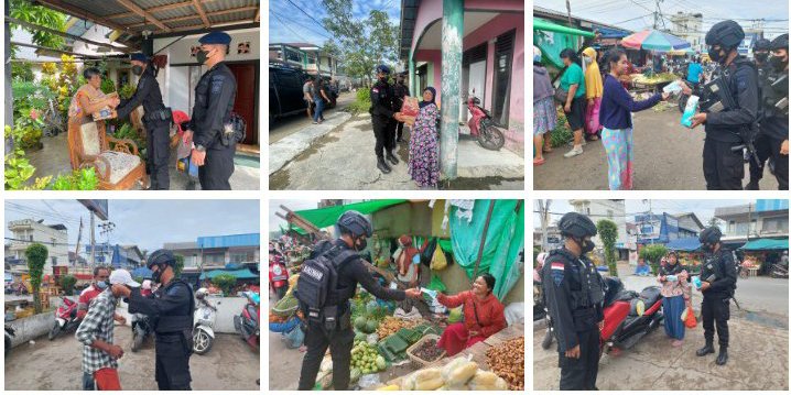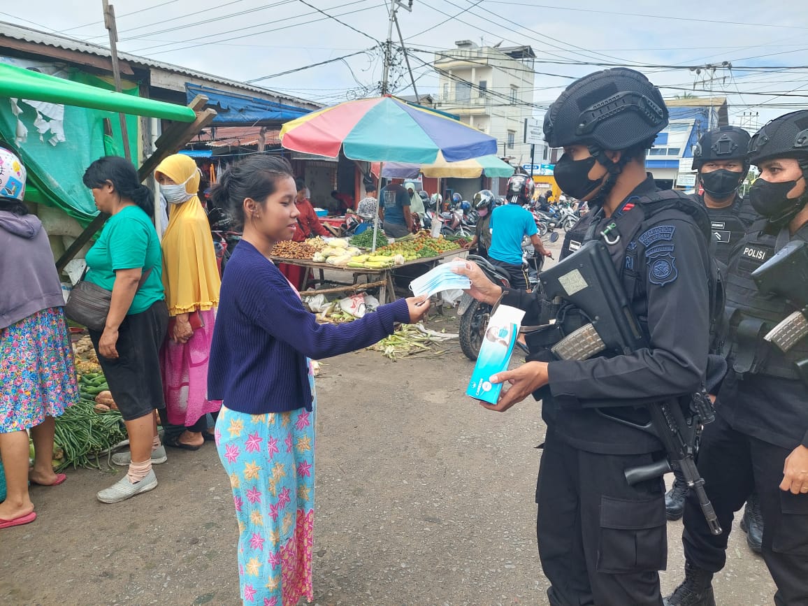 Selain melakukan sosialisasi penerapan protokol kesehatan disini personel Satbrimob Polda Kalbar juga membagikan masker kepada masyarakat yang mereka temui tidak menggunakan masker pada saat melakukan aktivitas berdagang dan berbelanja di pasar.