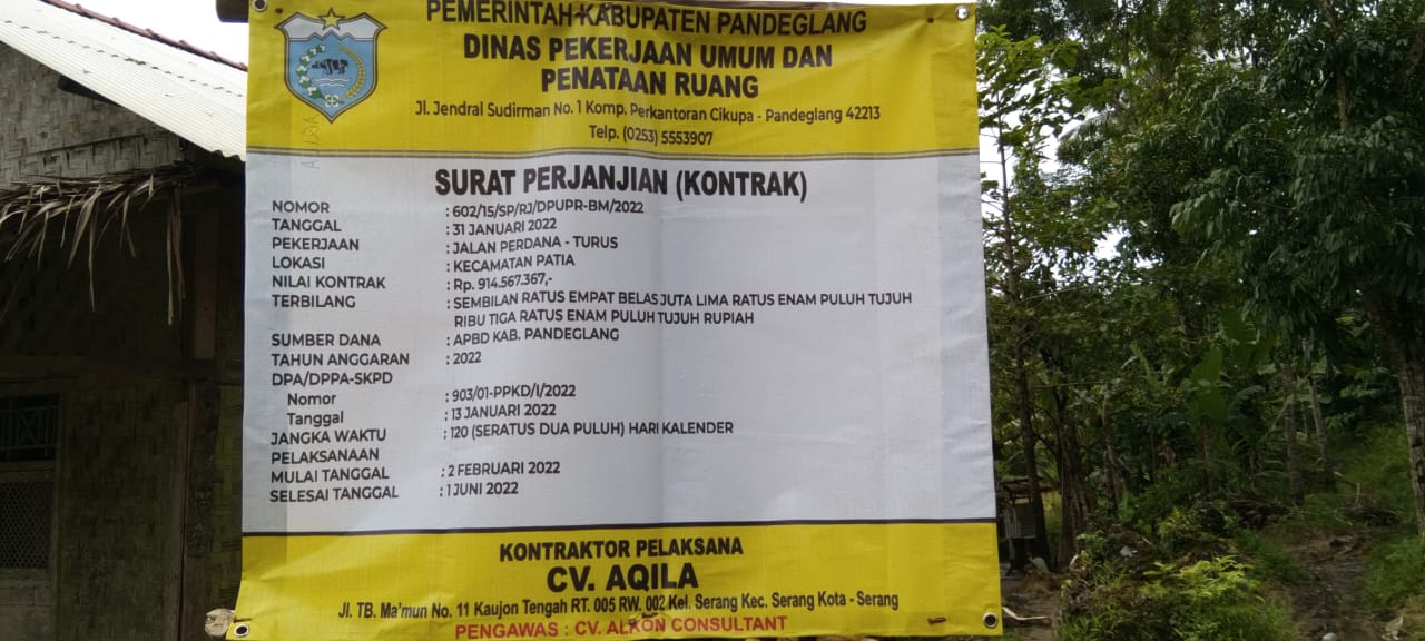 PANDEGLANG – BANTEN | Proyek Pembangunan Tembok Penahan Tanah (TPT) Ruas Jalan Perdana – Turus kecamatan Sukaresmi Pandeglang diduga asal jadi, padahal pelaksanaan proyek itu menelan biaya yang tidak sedikit hingga mencapai Rp. 914.567.367,- (Sembilan Ratus Empat Belas Juta Lima Ratus Enam Puluh Tujuh Ribu Tiga Ratus Enam Puluh Tujuh Rupiah) disinyalir pekerjaan tersebut melenceng dari ketentuan kontruksi (Bestek).