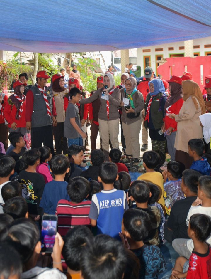 Raut bahagia tampak dari wajah anak- anak penyintas gempa bumi Cianjur ketika Bunda PAUD Jabar Atalia Praratya Ridwan Kamil membacakan dongeng berjudul “Dinda Tidak Rewel Lagi” di SD Negeri Cipadang, Cianjur, Minggu (4/12/2022).