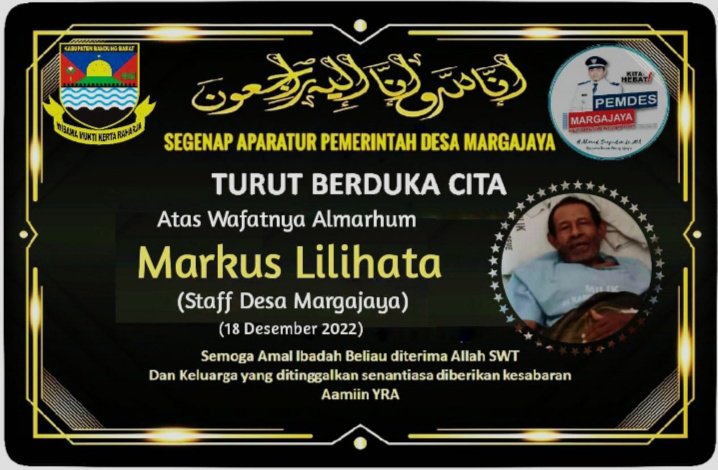 BANDUNG BARAT, JABAR | Keluarga Besar Desa Margajaya mengucapkan turut berduka cita dan ikut berbelasungkawa atas berpulangnya sahabat Kami, Markus Lilihata bin Adven Lilihata (62) , Minggu, 18 Desember 2022 di Rs Kharisma, Bandung Barat Pada Pukul 04.15 Wib.