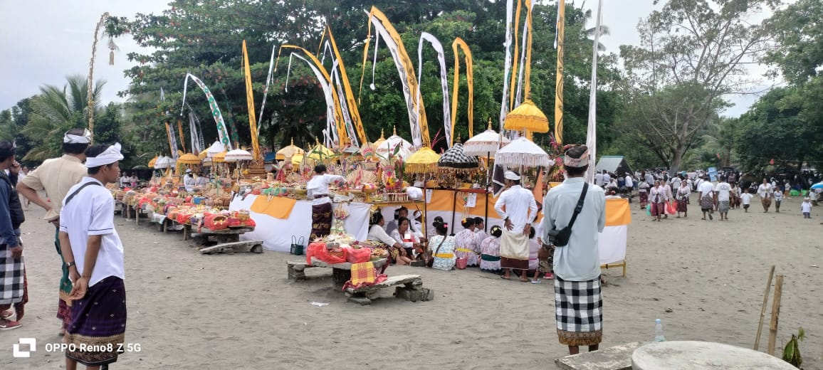 Upacara Melasti dipimpin oleh Pinandita Jero Mangku Wayang Serkan dari Para’ili dan Jero Mangku Iwayang Ruka dari Salupangkang. Sekitar 1.200 umat Hindu turut hadir dalam tradisi penyucian diri dan alam semesta ini sebelum menyambut Hari Raya Nyepi. Suasana penuh khidmat tampak menyelimuti prosesi yang berlangsung di tepi pantai.