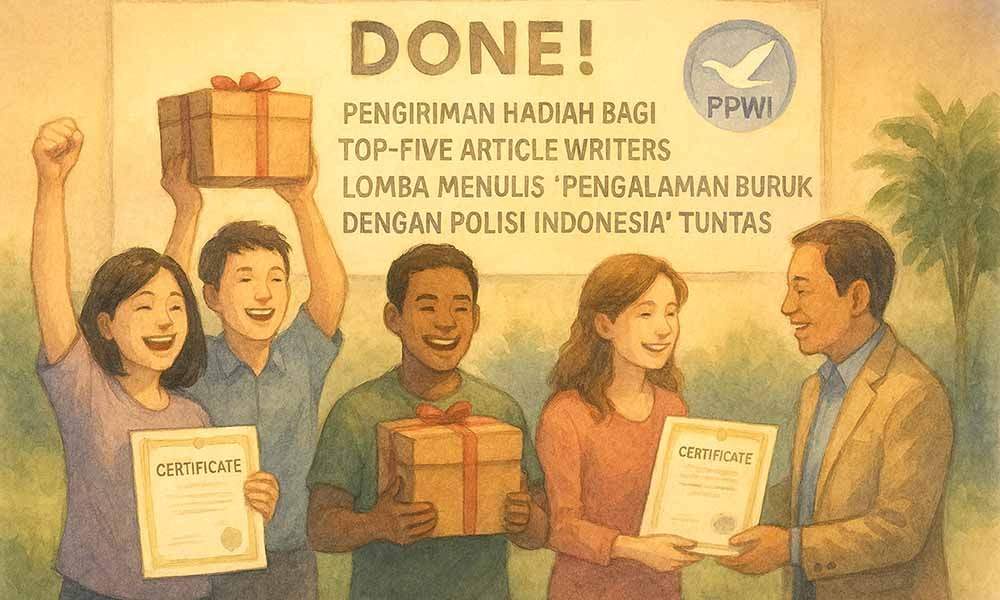 JAKARTA – Proses pengiriman hadiah bagi lima penulis artikel terbaik dalam lomba menulis bertema “Pengalaman Buruk dengan Polisi Indonesia” yang diselenggarakan oleh Persatuan Pewarta Warga Indonesia (PPWI) telah resmi tuntas hari ini, Sabtu, 20 Desember 2025. Kelima penulis yang terpilih sebagai pemenang telah menghubungi Sekretariat Nasional PPWI untuk konfirmasi data pengiriman.