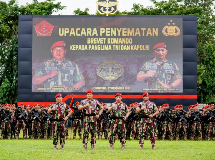 JAKARTA | Penyematan Baret Merah dan Brevet Komando Kopassus kepada Kapolri Jenderal Listyo Sigit Prabowo dan Panglima TNI Laksamana Yudo Margono merupakan kebanggaan dan kehormatan yang luar biasa baik secara institusi Polri maupun pribadi selaku Kapolri. Hal tersebut disampaikan Kapolri Jenderal Listyo Sigit Prabowo saat dirinya dan Panglima TNI Laksamana Yudo Margono disematkan Baret Merah dan Brevet Komando dari pasukan elite Kopassus.