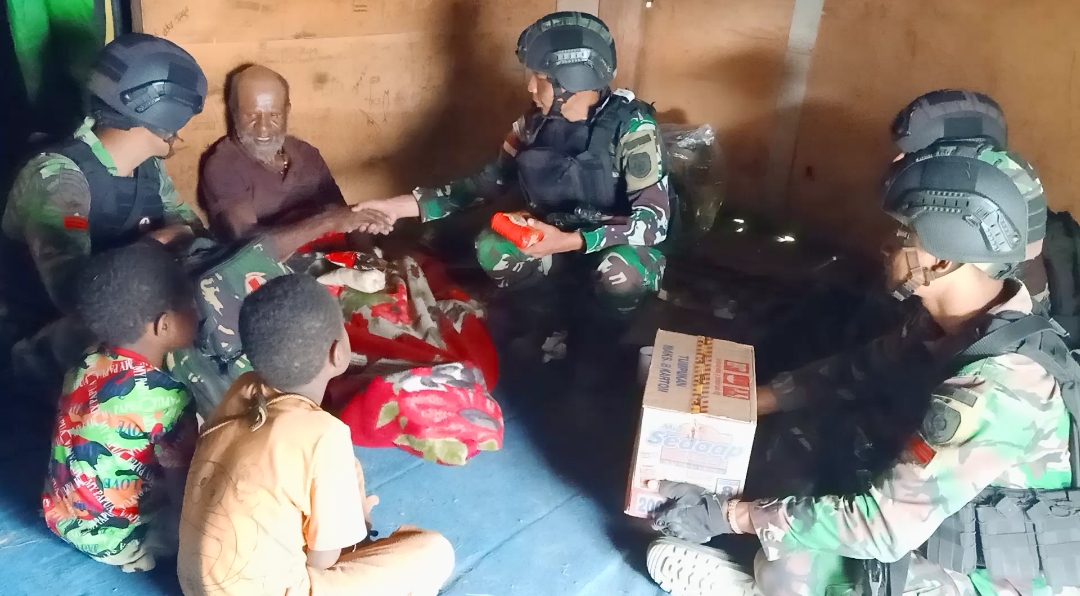 LANNY JAYA, PAPUA | Sudah hampir dua minggu Bapak Pekiles Kiwo terbaring sakit di Honainya (rumah adat Papua), mendengar kabar tersebut Prajurit Satgas Yonif MR 412 Kostrad dari Pos Malagay bergegas untuk mengunjungi Bapak Pekiles Kiwo di rumahnya di Desa Gilo Distrik Malagay Kabupaten Lanny Jaya Papua