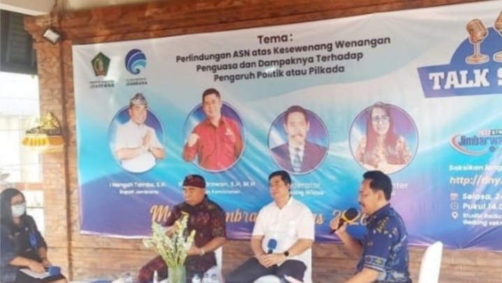 JEMBRANA | Menuju Jembrana Emas 2026, Pemerintah Kabupaten Jembrana dan Diskominfo Jembrana menyelenggarakan talkshow dengan tema Perlindungan Aparatur Sipil Negara (ASN) Atas Kesewenang-wenangan Penguasa Dan Dampaknya Terhadap Pengaruh Politik atau Pilkada. Talkshow disiarkan langsung via streaming melalui JimbarwanaTV YouTube Channel dan Ananta Praja Swara 99.9 FM dari Gedung Sekretariat Bersama, Studio Ananta Praja Swara pada Selasa (24/5/2022).