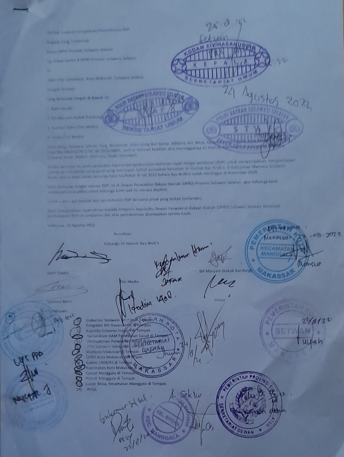 “Kami memilih wakil rakyat di Sulawesi Selatan bukan di Sulawesi Barat itu karena KTP ku di Sulawesi Selatan makanya kami minta RDP terkait kematian Ayu Andira jadi saya minta kepada DPRD untuk memfasilitasikan maupun pihak-pihak terkait di dalamnya karena pemerintah Sulsel maupun anggota DPRD kan bapak dan ibu kami disini,” jelasnya.