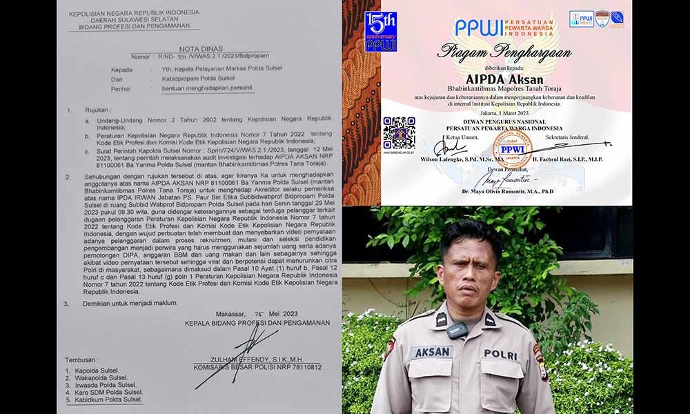 infoindonesiainews.com | JAKARTA – Aipda Aksan adalah seorang Polisi jujur yang saat ini bertugas di unit Pelayanan Masyarakat (Yanma) Polda Sulawesi Selatan. Sebelumnya, yang bersangkutan ditugaskan sebagai Bhabinkatibmas di Polres Tana Toraja, Sulawesi Selatan.