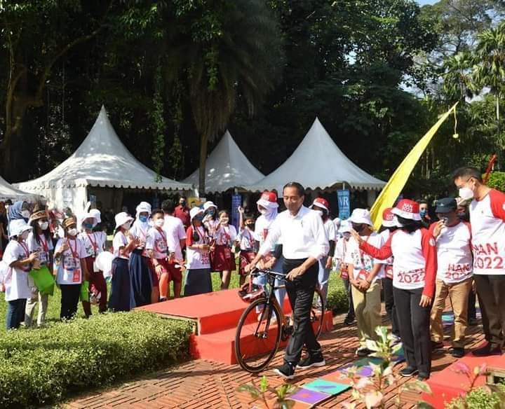 BOGOR | Presiden Joko Widodo menghabiskan akhir pekan bermain bersama anak-anak di Taman Teijsmann, Kebun Raya Bogor, Provinsi Jawa Barat, pada Sabtu, 23 Juli 2022. Hadir dalam Peringatan Puncak Hari Anak Nasional (HAN) tahun 2022, Presiden tiba sekira pukul 09.10 WIB dengan mengenakan sepeda dari Istana Kepresidenan Bogor.