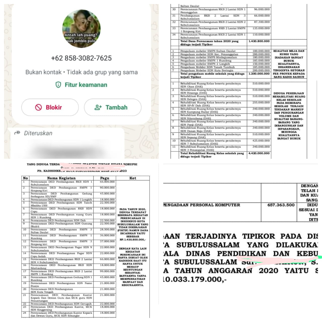 Judul utama dokumen tersebut berbunyi: “Daftar Kegiatan pada Dinas Pendidikan dan Kebudayaan Kota Subulussalam Tahun Anggaran 2020 yang Diduga Terdapat Praktek Tindak Pidana Korupsi Tahun 2019 s/d 2023.” Pada bagian akhir dokumen, disebutkan bahwa dugaan kerugian negara akibat praktik tipikor di tahun anggaran 2020 saja mencapai Rp10.033.179.000 (sepuluh miliar tiga puluh tiga juta seratus tujuh puluh sembilan ribu rupiah).