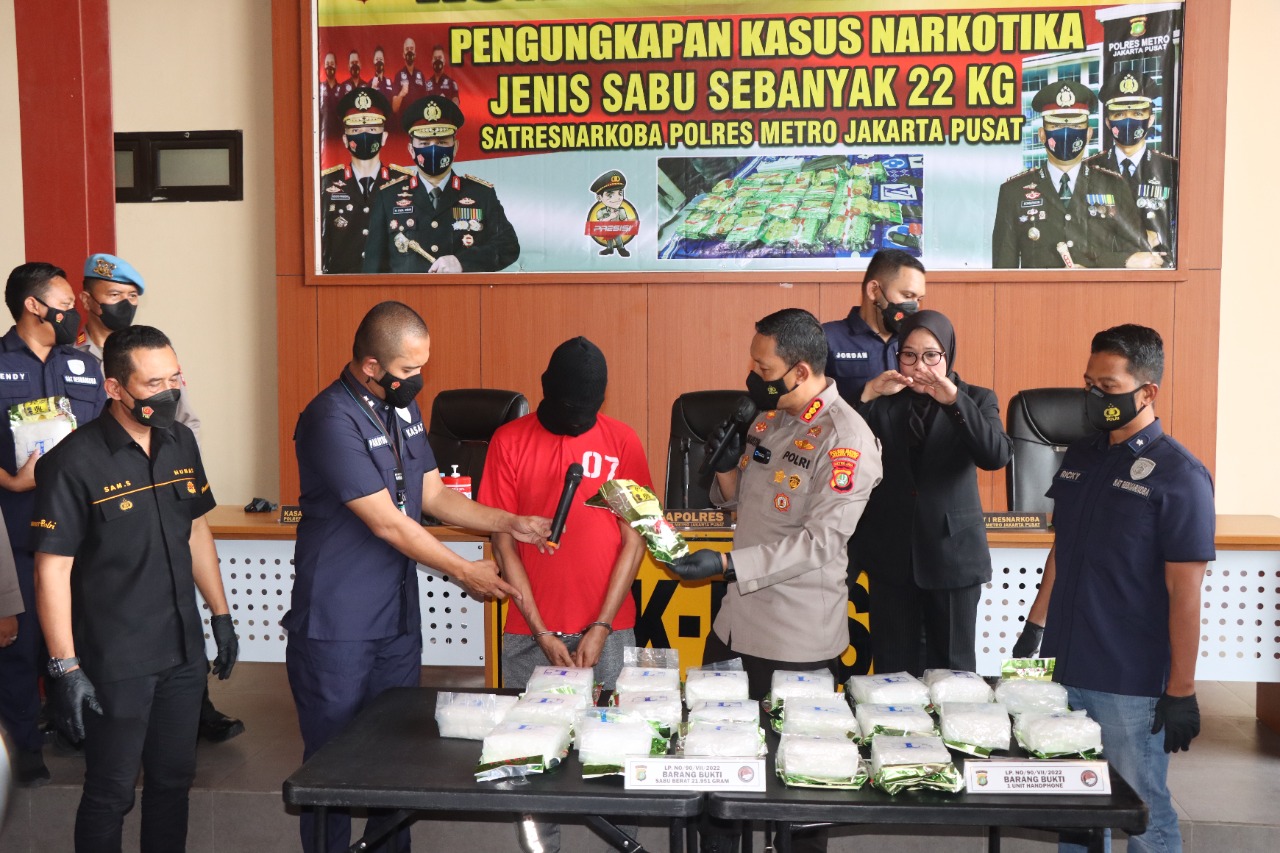 Dari hasil penelusuran dan pendalaman tersebut tim Sat Resnarkoba Polres Metro Jakarta Pusat berhasil mengamankan 22 kantomh Sabu, dengan kemasan teh Cina dengan berat 22 Kg.
