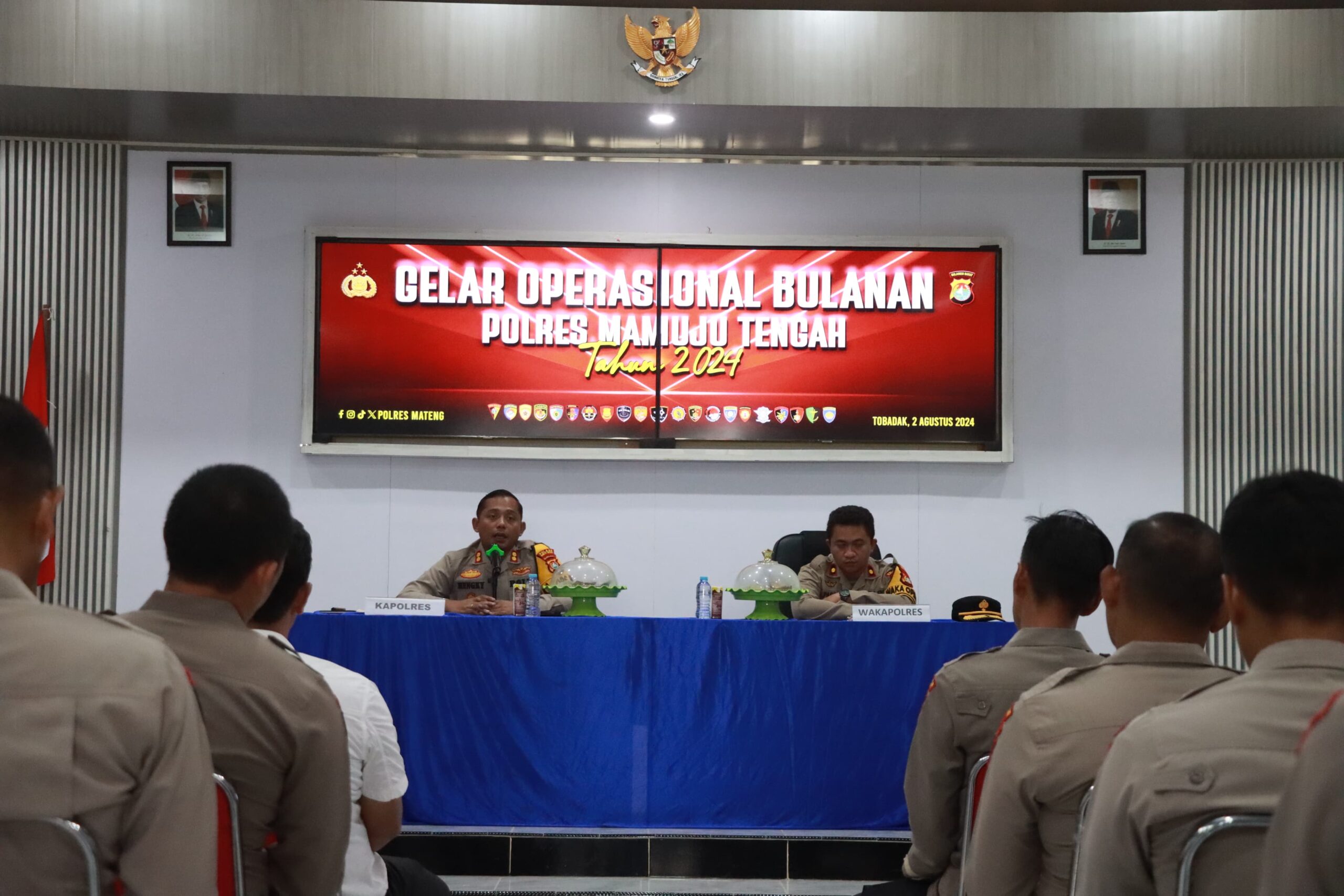 INFOINDONESIAINEWS.COM | POLRES MAMUJU TENGAH – Kepolisian Resor Mamuju Tengah (Mateng) mengadakan kegiatan Gelar Operasional (GO) bulanan yang dipimpin langsung oleh Kapolres Mamuju Tengah AKBP Hengky K. Abadi, didampingi Wakapolres Kompol Alfiando Papona. Kegiatan ini dihadiri oleh para kabag, kasat, kasi, dan kapolsek jajaran Polres Mamuju Tengah, bertempat di Aula Wicaksana Laghawa. Jumat (2/8/2024).