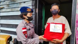 PONTIANAK | Personel Polwan Satbrimob Polda Kalbar kembali berbagi rezeki kepada masyarakat yang kurang mampu penghuni bantaran Sungai Landak Kota Pontianak. Jumat (08/04/22).