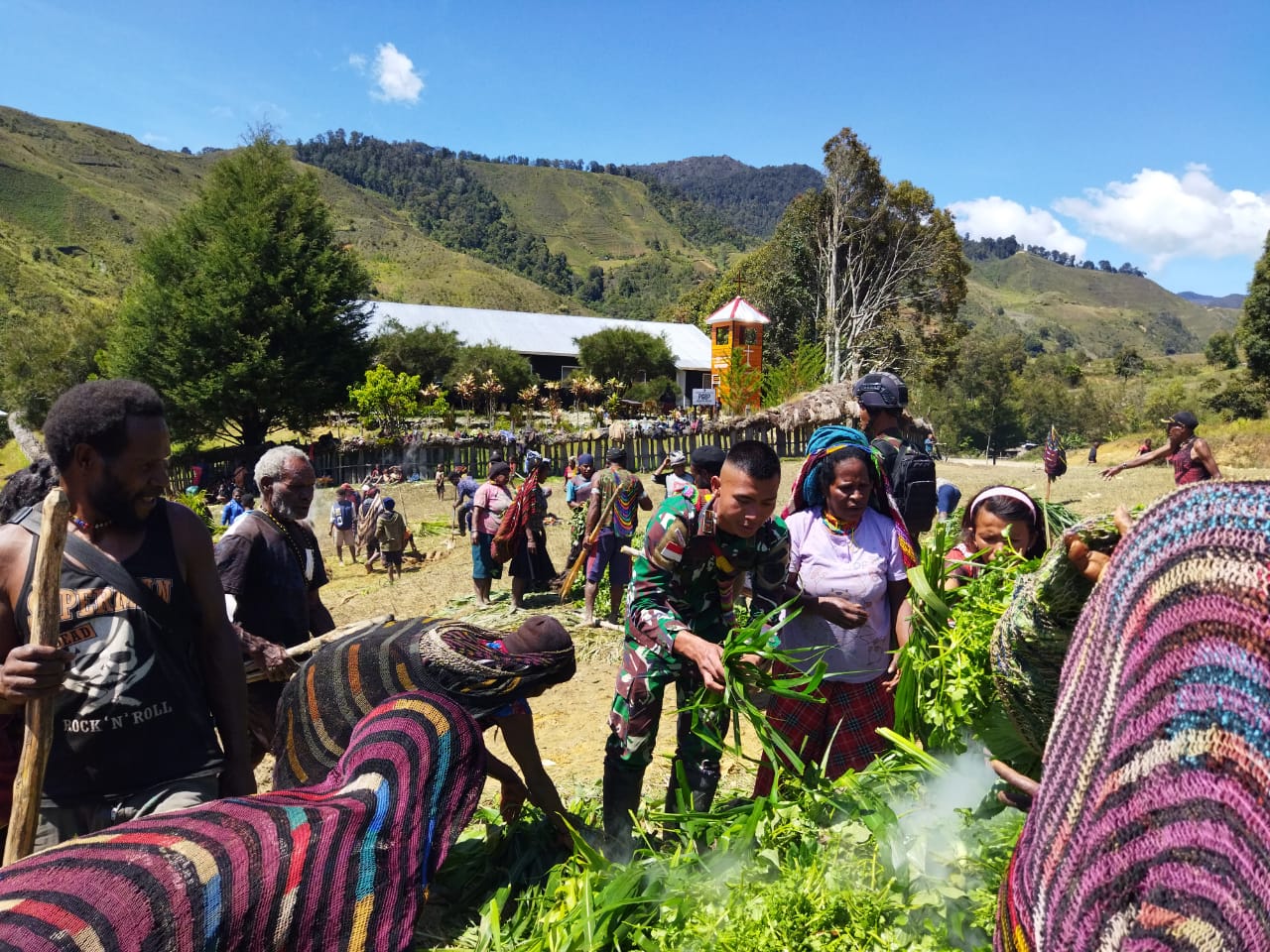 Lanny Jaya, Papua |Sebagai wujud rasa kebersamaan dan kekeluargaan para Prajurit Satgas Yonif MR 412 Kostrad yang berada di Pos Malagay turut serta hadir dalam acara tradisi adat bakar batu yang diadakan oleh Masyarakat Desa Pinime Distrik Malagay Kabupaten Lanny Jaya Papua, namun kali ini bukan daging babi dan ubi yang dimasak dalam acara bakar batu tersebut melainkan jagung hasil panen masyarakat
