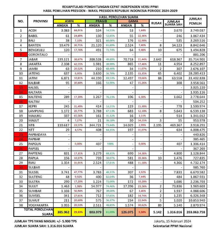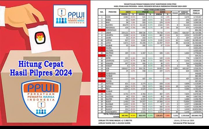 Berikut data Hitung Cepat Hasil Pilpres 2024 Versi PPWI: