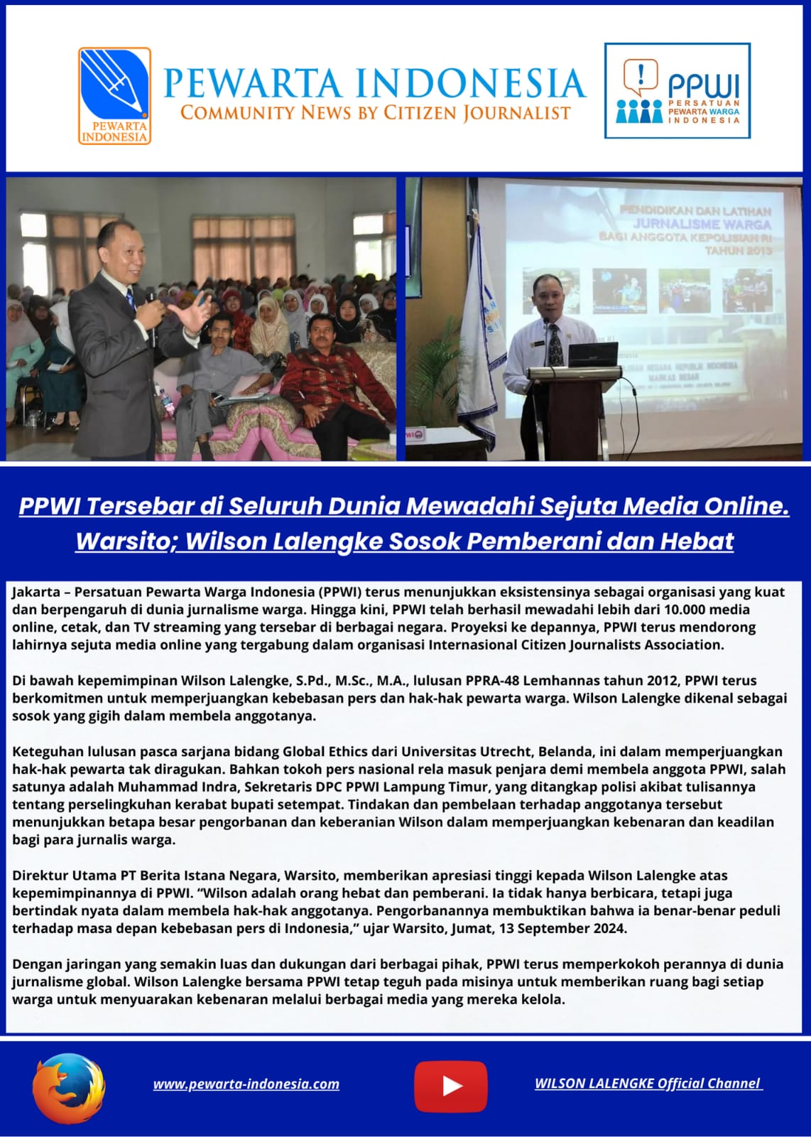 Direktur Utama PT Berita Istana Negara, Warsito, memberikan apresiasi tinggi kepada Wilson Lalengke atas kepemimpinannya di PPWI. “Wilson adalah orang hebat dan pemberani. Ia tidak hanya berbicara, tetapi juga bertindak nyata dalam membela hak-hak anggotanya. Pengorbanannya membuktikan bahwa ia benar-benar peduli terhadap masa depan kebebasan pers di Indonesia,” ujar Warsito, Jumat, 13 September 2024.