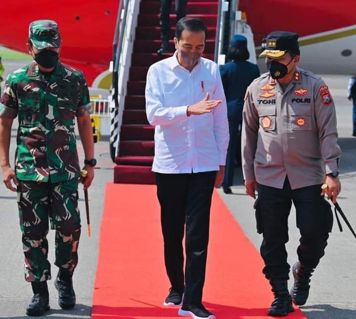 Setibanya di Bandara Internasional Juanda, Kabupaten Sidoarjo, Presiden disambut oleh Wakil Gubernur Jawa Timur Emil Elestianto Dardak, Pangdam V/Brawijaya Mayjen TNI Nurchahyanto, Kapolda Jatim Irjen Pol. Toni Harmanto, dan Danlanudal Juanda Kolonel Laut Heru Prastyo.