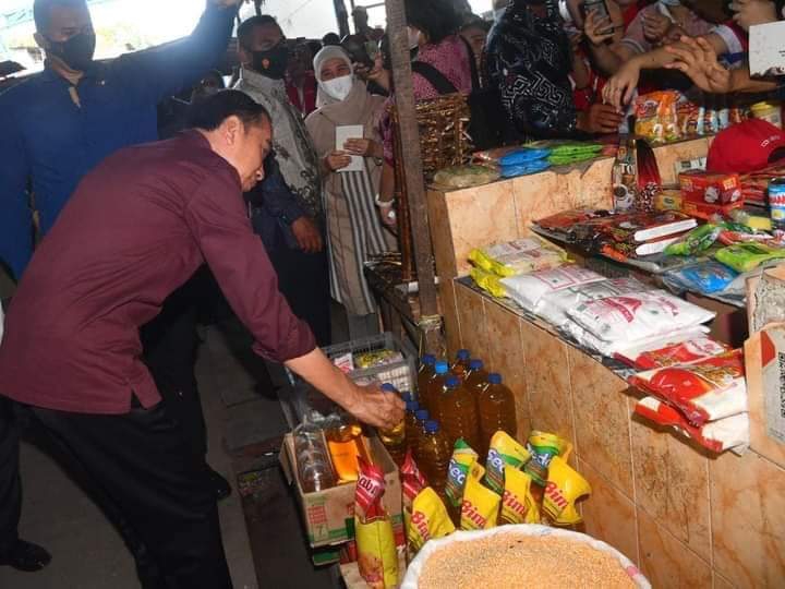 Presiden langsung berkeliling menyapa pedagang untuk membagikan bantuan sosial (bansos) sembako dan bantuan tunai. Selain itu, momen berkunjung ke pasar juga dimanfaatkan Presiden untuk mengecek harga-harga sembako.