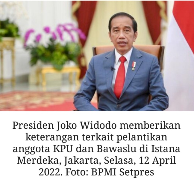 Presiden Joko Widodo telah melantik anggota Komisi Pemilihan Umum (KPU) dan Badan Pengawas Pemilihan Umum (Bawaslu) periode 2022-2027 di Istana Negara, Jakarta, Selasa, 12 April 2022. Presiden berharap anggota KPU dan Bawaslu tersebut bisa segera menjalankan tugas dan kewenangannya menyiapkan pemilu dan pemilihan kepala daerah (pilkada) tahun 2024.